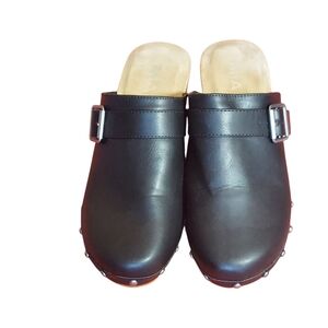 Mia Milou Black Vegan Leather Silver Buckled and Studded Wooden Heel Clogs