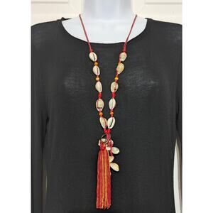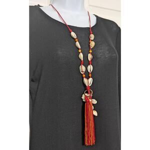 MIA Collection Cowrie Shell Tassel Long Necklace Red Cord Adjustable Boho Women