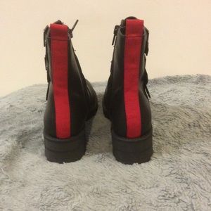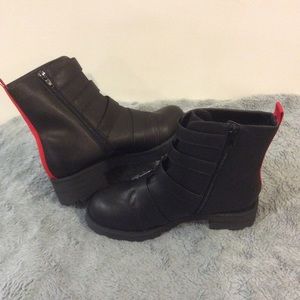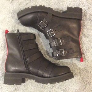 Make a bold statement all throughout the day with this stunning combat-style boot. Faux leather upper with 4 decorative, functional buckled straps up vamp. Inside zip closure with back pull-tab for easy on-off. Lightly cushioned footbed and lug outsole. 6" shaft; 11" opening circumference; 1-3/4" block heel. Size 6.5