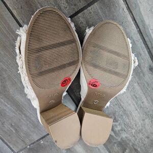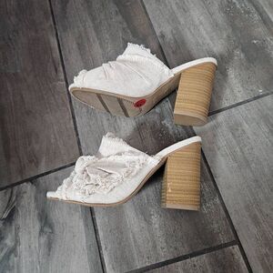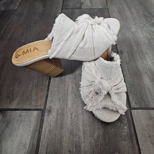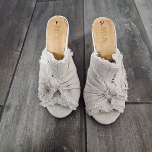The MIA Gemma Slide heels are open-toe mule-style heels with a chunky stacked wooden heel. The upper part of the shoe is made from a light, textured fabric that features frayed edges for a relaxed, boho-chic look. A large knotted bow detail dominates the front, giving the slides a feminine and playful aesthetic. These heels combine comfort with a trendy, casual vibe, making them ideal for warm-weather outfits or casual summer events. The neutral colors enhance their versatility. Note some wear on these shoes, as shown in the photos.