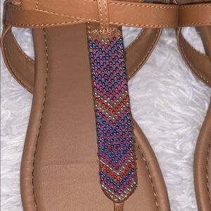 TAGS: western southwestern tribal print bedazzled beaded embellished bejeweled rhinestone encrusted casual school going out summer girl sandals shoes brown outdoor beach vacation spring open toe colorful