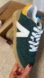 Stylish green sneakers featuring yellow and white accents. Perfect for casual wear.