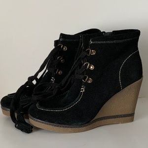 MIA Hazel Suede Leather Loafer Lace Up Wedge Booties. Size 8. Super Cute! Fringe Lace detail, tie up, with zipper side. See photos for details.