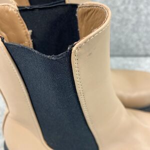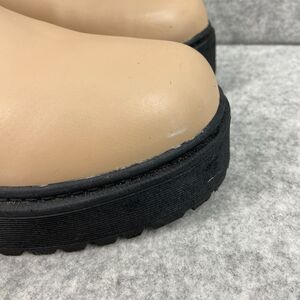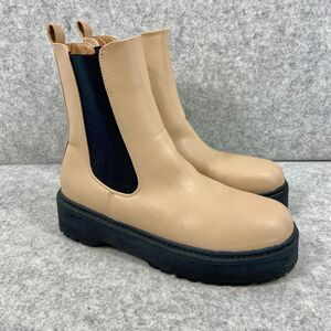 MIA Leigha Womens Tan Faux Leather Chunky Lug Sole Chelsea Ankle Boot Size 8.5M. 1..75" block heel with a 1" platform; double black elastic gore sides; back pull tabs. Great pre-owned condition. Small white mark on right shoe (see close up pic).