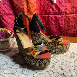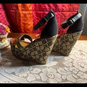 Vibrant platform wedges with intricate patterns. Features multicolor design with black accents. Perfect for a bold statement.