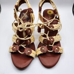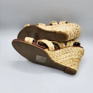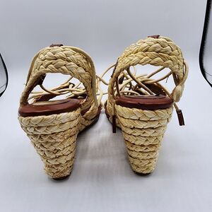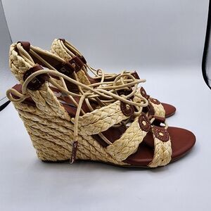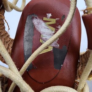 MIA Nikola brown & tan lace up raffia 3.5" wedges has small flaw on inside shown in picture Box 7