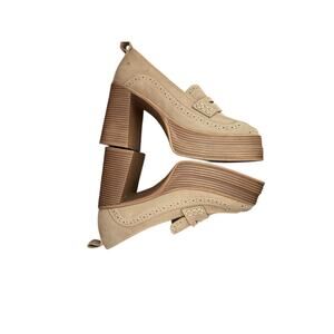 Mia Nissa Platform Loafer Pump in the color "stone beige". This style is characterized by its chunky block heel, platform sole, and classic brogue detailing on the upper.