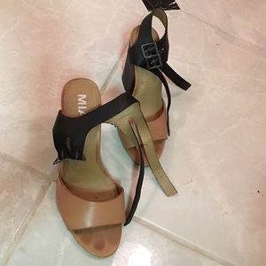 Leather straps brown/black, wooden black heel. Great for work or casual wear out.