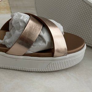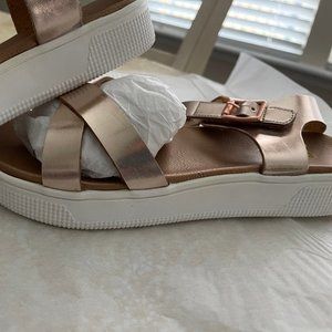 Nice sandals, rose gold color, ankle strap, soft and very comfortable, with some platform, the box says MIA KIDS but they fit a woman with a small foot size 6M, they are relatively new, they were used only for size but the insoles look somewhat dark or dirty, one of them has a spot on the ankle strap that is attached to the sole and one on the front that is attached to the sole (you can see it in the photo) factory defect, both pairs in their boxes.