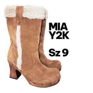 MIA Sz9 Y2K Tan Suede Faux Shearling Trim Retro Boho Hippie Wood Heel Clog Boots