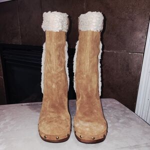 MIA Sz9 Y2K Tan Suede Faux Shearling Trim Retro Boho Hippie Wood Heel Clog Boots