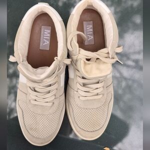 Shoes for men Step into style with MIA's Tan and White Sneakers, crafted for both comfort and versatility. These sneakers feature a breathable perforated toe box and a classic lace-up design, ensuring a snug fit. The mid-cut silhouette adds a contemporary flair, making them perfect for everyday wear. With their neutral tones, these sneakers effortlessly complement any outfit.