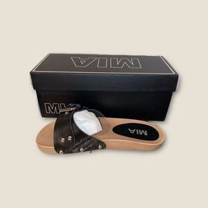 Features: Wooden Sole, Buckle Toe Strap, Stud Accents, Slip-On Style, Open Toe, Cushioned Footbed