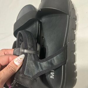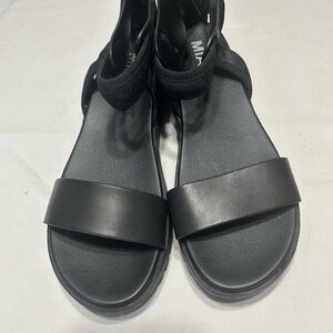 Chic black sandals by MIA. Features sleek straps. Perfect for any occasion. Army fatigue print on side straps.