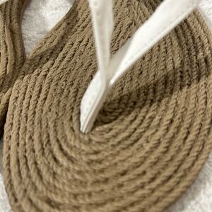Stylish sandals featuring sleek white straps. Durable brown woven sole. Ideal for everyday comfort.