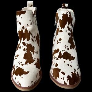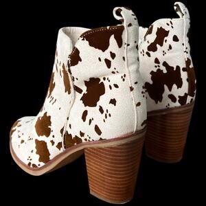 Get ready to strut your stuff in these super cute MIA cow print ankle boots. These boots are in excellent condition. The perfect addition to any closet! These boots are a size 6.5 and have a heel. They have an ivory and brown cow print design, perfect for a western-inspired look.