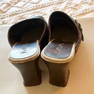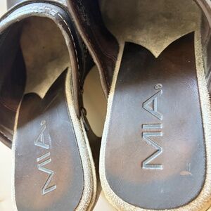 Brown, MIA slip on clogs/mules. Sturdy heel, very comfortable. Very minor scuff pointed out in last picture.