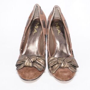 MIAÂ BrownâSuede Round Toe Pumps with MetallicâBow, Size 8