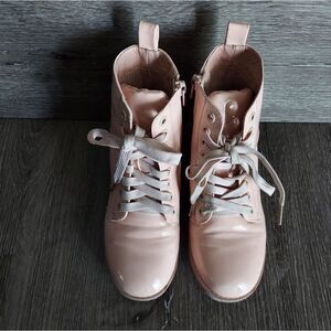 The MIA Girl's Claudina Glitter Sole Boot in Pink Patent is a stylish footwear choice for your little one. Featuring a round toe and a captivating patent finish, these boots are equipped with a medium width for comfort. They include a lace-up design with a convenient side zip closure, ensuring a snug fit. Crafted from manmade materials, these imported boots boast a cushioned insole and glitter midsole for added flair, supported by a dependable grip sole.