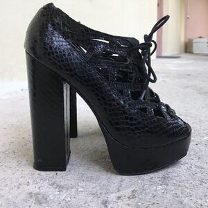 These platforms are great, man-made materials that feel n looks like embossed snakeskin. They are in very good condition with very slight wear on the heel