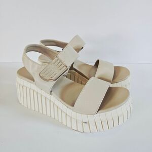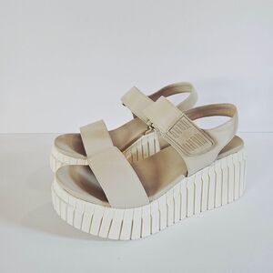 The YURI sandal is designed from a soft, vegan leather upper with a single strap and velcro hook-and-loop ankle closure. The unique sole features a subtle wedge design, complemented by a distinctive pattern of diagonal lines, adding a touch of modern flair to the sandal's overall look. Finished on our signature contoured footbed and subtle 2.8-inch wedged design, YURI is your new spring staple. These are in excellent pre-owned condition. Some minor marks on the soles and straps.