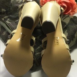 Michael Antonio double buckle ankle straps, antique silver/pewter flathead studded, high heel cage gladiators. Bone/cream yellow color. Faux leather. Chunky 4 inch heel.