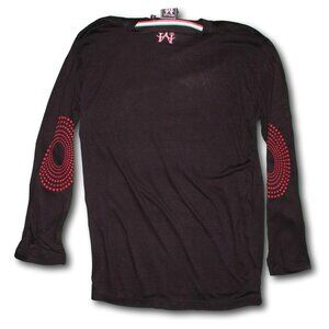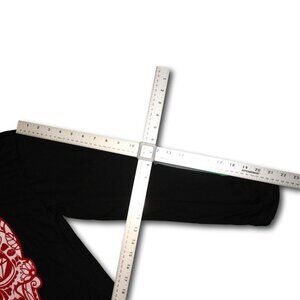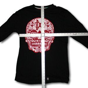 Michael Cherry long sleeve black t-shirt with skull design. Skull is flocked in red. There is some pink around the skull...I don't know if it's an intentional ombre look or if there was some color transfer from the flocking. It hasn't been washed so it may come out, may not. Very lightweight, semi-sheer cotton jersey fabric. New with tags, clean, no flaws found.