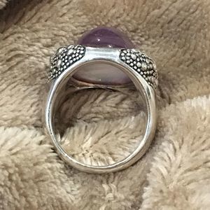 The MICHAEL DAWKINS Starry Night Sterling Silver Amethyst Over Mother of Pearl Doublet Ring Contrasts Beautifully With The Oxidized Background and Silver Caviar Droplets