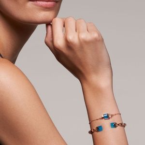 Crafted from 14K rose gold-plated sterling silver and accented with a miniature key detail, this bracelet features an iconic MK Mercer lock designed in genuine aquamarine-dyed agate. Make it your everyday signature!