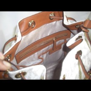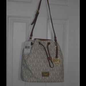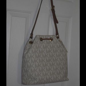 Exterior features gold-tone hardware, signature lettering and detachable logo charm Interior features 1 zip pocket, 3 open pockets, 1 cell phone pocket and key fob. this bag is 100% Authentic. The size is 11-1/2" W x 11" H x 4" D COLOR: Vanilla. We accept paypal. No trade. Thank you.