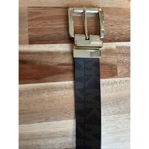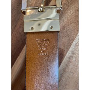 This Michael Kors women's Logo print Belt is a stylish accessory made of brown leather. The belt features a solid pattern with the brand's logo accents and gold-tone hardware. A chic and practical addition to any wardrobe.