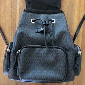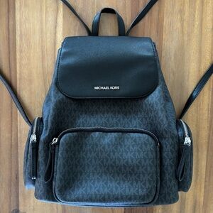 Description: Authentic Michael Kors Abbey Large Cargo Backpack in classic black with silver-tone hardware. Features the signature MK logo design, adjustable straps, flap top with magnetic closure, and spacious compartments including front and side zip pockets.