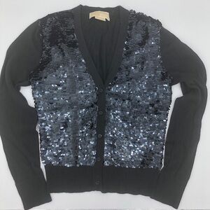 Overlapping sequins light up the front of an ultra soft, lightweight cardigan By MICHAEL Michael Kors. Front button closure.