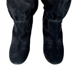 From Steve Madden are these gorgeous scrunchy shaft boots in black genuine suede leather with leather trim! Hidden Velcro inset at top, gold logo hardware, hidden inside zipper! 4" heel, 15" shaft height, 15" circumference at top calf, adjustable via the Velcro,! Size 9.5M, Excellent! Superb EUC Condition! **ABSOLUTELY GUARANTEED CONDITION: EUC MINTY-EXCELLENT TO LIKE-NEW, by Lily @HauteClub!***