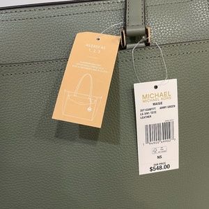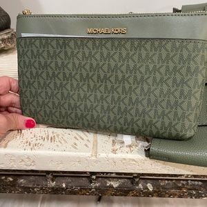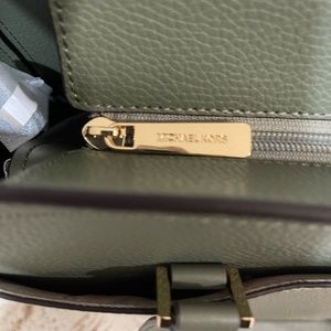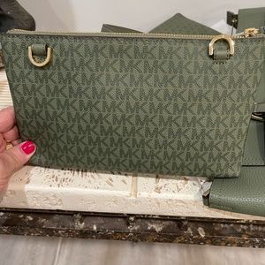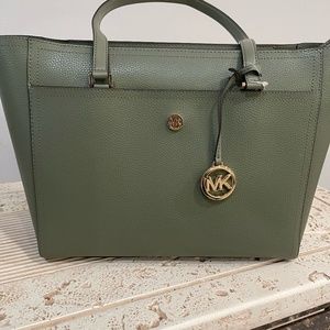 Michael Kors beautiful sage green handbag. Has two smaller insert bags or big enough to be used as a clutch. The smaller bag can be attached to the inside with snaps (picture shown) Has long strap so it can be used as a shoulder bag.