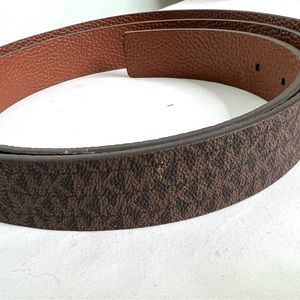 New with tags brown on 1 side, and dark brown on the other genuine leather a twist gold colored buckle that has some marks on it as seen in pictures with silver MK in the middle