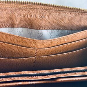 Elevate your accessory collection with this Michael Kors wallet. Its zip-around design ensures security, while the rich brown leather adds a touch of elegance. Organized interior compartments provide ample space for cards,Money, and coins.