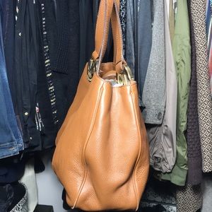 Soft tan leather, five pockets and magnetic closure. Gold hardware accents this is a great bag. Gently used, some stains inside and small hardly visible pen mark on the handle.