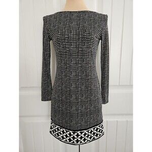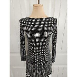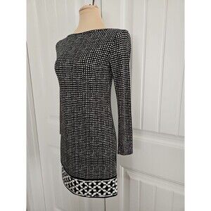 This is a Michael Kors sheath dress in a black and white geometric pattern, featuring long sleeves and a pullover closure. It is a size P and made of a lightweight polyester blend fabric with a slinky texture. Suitable for various occasions such as travel, parties, workwear, and formal events, this classic dress has a short length and offers stretch for comfort.