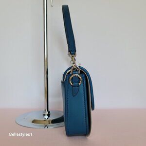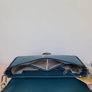 BRAND NEW WITH TAGS. Deep Mountain color. A stylish structured crossbody with both shoulder and crossbody straps for versatile wear with enough room to carry your essentials day or night. Features a flap push-lock closure and a back slip pocket for added storage. Crafted from woven smooth leather with MK charm on the top handle for added detail.