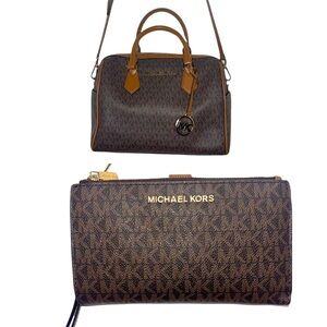MICHAEL KORS Brown Signature MK Pattern Duffel Satchel & Double Zip Wallet
