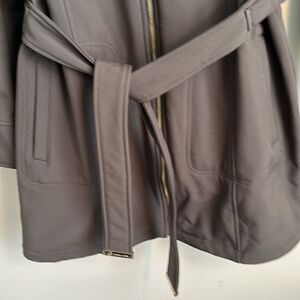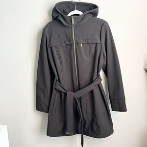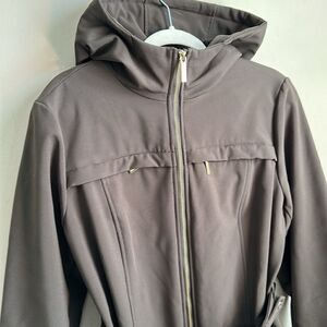 Brown cocoa colored hooded jacket with gold accents, multiple pockets throughout and belt tie in EUC.