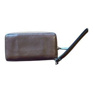 Elegant wristlet by Michael Kors. Features a tan finish and gold logo accent. Includes a handy strap for easy carrying.