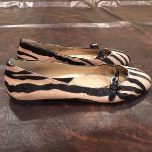 MICHAEL KORS CALF HAIR & LEATHER FLATS SIZE 7.5 WORN ONCE. MICHAEL KORS EMBLEM ON THE LEFT SHOE IN WHITE, NOT IN WHITE ON THE RIGHT SHOE. DON'T KNOW IF IT HAS BEEN RUBBED OFF.