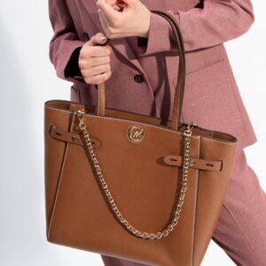 Elevate your style with the MICHAEL KORS Carmen Large Tote, a luxurious and versatile carryall perfect for any occasion. Crafted from high-quality pebble leather, this tote comes in a rich Chestnut color, exuding elegance and sophistication. The tote features exquisite gold-tone hardware, including a stylish chain detail that adds a touch of glamour. Its spacious interior allows you to carry all your essentials with ease, making it ideal for both work and leisure. The sturdy double handles provide a comfortable carry, while the secure top keeps your belongings safe. Whether you're heading to a business meeting or a casual outing, the MICHAEL KORS Carmen Tote is your go-to accessory for effortless style. New with tags
