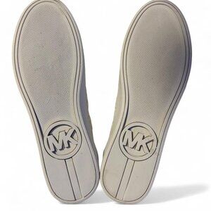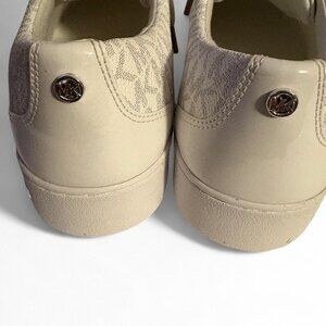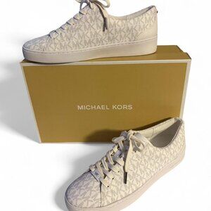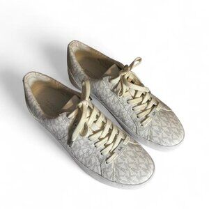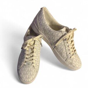 Description: These are women's low-top sneakers featuring the iconic Michael Kors "MK" monogram print in a subtle, light color (often referred to as "vanilla"). They have a lace-up closure and a round toe, made with a manmade faux leather upper and a rubber sole.