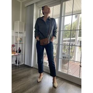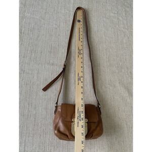 Exterior: genuine brown camel color leather; press & lift flap adjustable strap. Hardware: gold. Interior: fully lined; 2 slot compartments on each side. Will fit iPhone plus