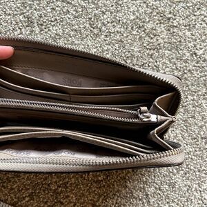 This bag and wallet are both in excellent condition. Neither have any holes, rips, or stains. Clean inside and out.
