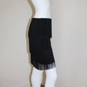 The skirt is lavishly covered in three tiers of swaying black fringe, the fringe has a subtle sheen over a matte base - it's hard to photograph and way better on the body than in the photos.