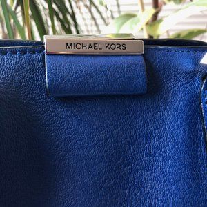 Grained nubuck Michael Kors Lexi East/West satchel with silver hardware, black leather trim, dual rolled top handles, single optional flat shoulder strap, single exterior slit pocket, cinched folded accents at sides, black canvas lining, two interior pockets; one with zip closure and magnetic snap closure at top with zip closures at sides.Excellent used condition